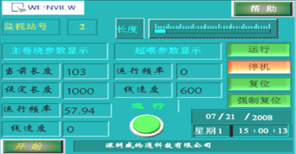 在觸摸屏主界面上,實時顯示當前通訊變頻器的各項主要參數,和當前狀態,分為:停機、運行、故障等多檔指示。同時利用棒圖元件形象直觀地實時顯示了當前絡筒機的長度參數。