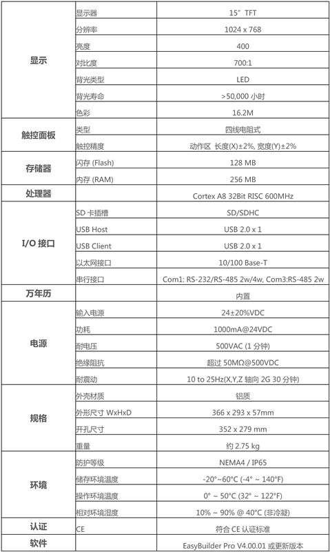 產(chǎn)品特點(diǎn) Installation 15" 1024x768 TFT LCD, LED 背光 無(wú)風(fēng)扇冷卻系統(tǒng) 內(nèi)置128MB閃存 支持USB主設(shè)備與USB從設(shè)備 支持SD卡擴(kuò)充儲(chǔ)存容量 COM1/COM3 RS485 內(nèi)置隔離器 COM1及COM3 RS485 2W 支持MPI 187.5K同時(shí)間請(qǐng)選擇一使用 內(nèi)置電源隔離器 NEMA4/IP65 前面板防護(hù)等級(jí)
